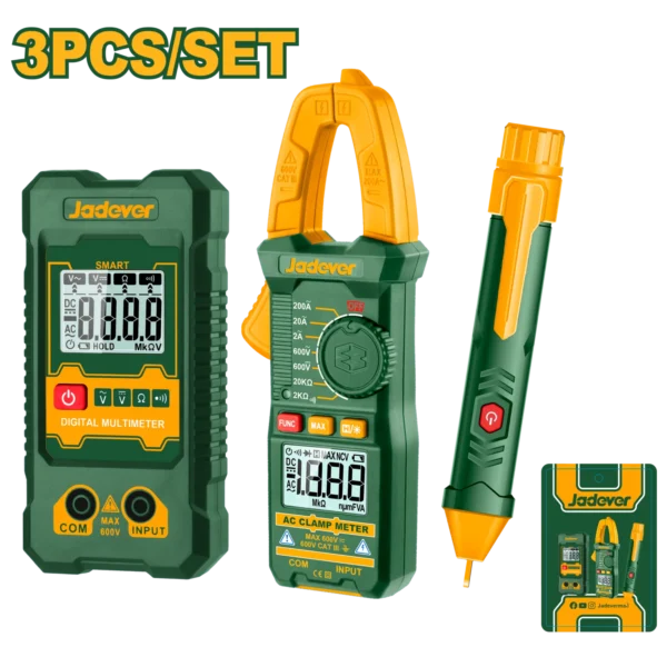 طقم معدات قياس كهرباء 3 قطع بنسة كلامب أمبير 200 أمبير + جهاز مالتيميتر ديجيتال 600 فولت + جهاز كشف التيار الكهربائي 12 فولت 1000 فولت/تيار متردد – JDDM94011