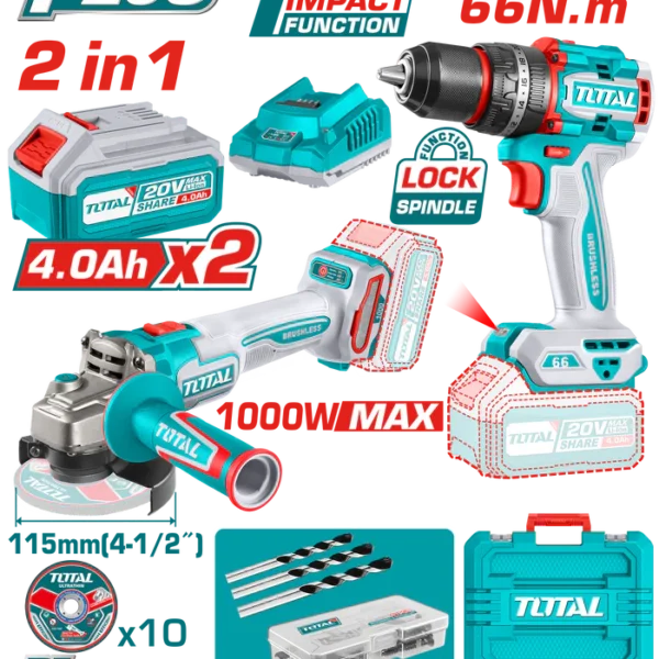 طقم كومبو توتال 20 فولت شنيور توتال 66 نيوتن + صاروخ توتال 4.5 بوصة مع بطارية 2 امبير و بطارية 4 امبير و شاحن – TCKLI20273