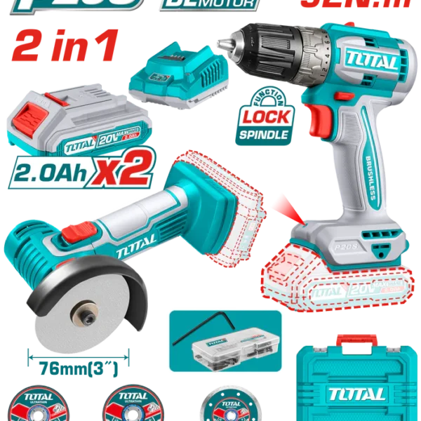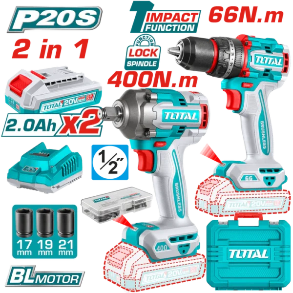 طقم كومبو توتال 20 فولت شنيور توتال 52 نيوتن + دريل توتال امباكت 285 نيوتن – TCKLI20272