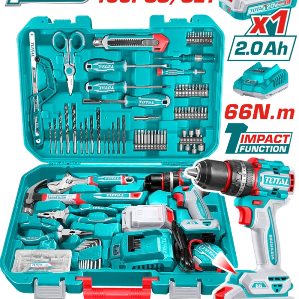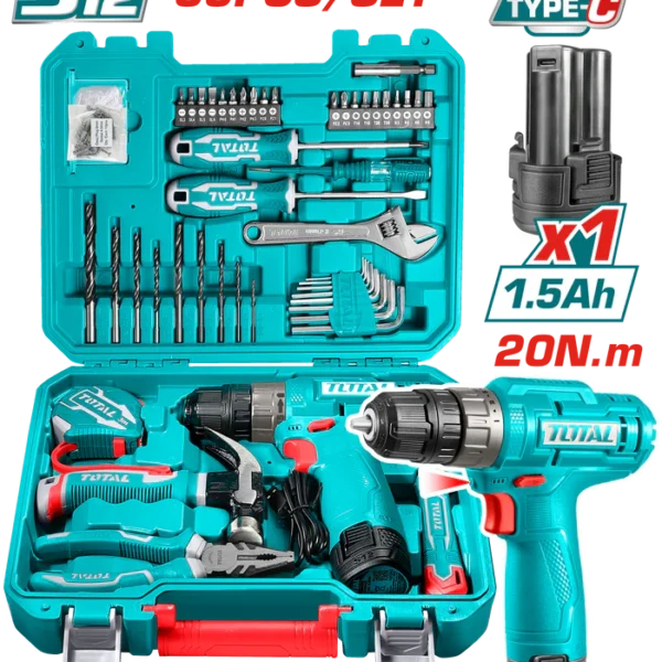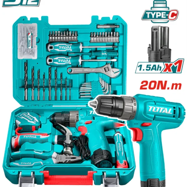 طقم دريل توتال 400 نيوتن 20 فولت مع طقم لقم تصادمية و بلادوس و 2 بطارية و شاحن – TOSLI23048