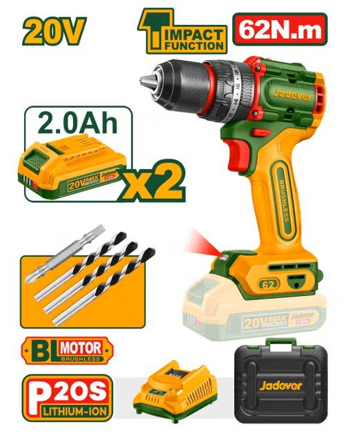 شنيور براشليس 13 مم 20 فولت دقاق 62 نيوتن 2 بطارية شنطة بلاستيك – JDCDP6281