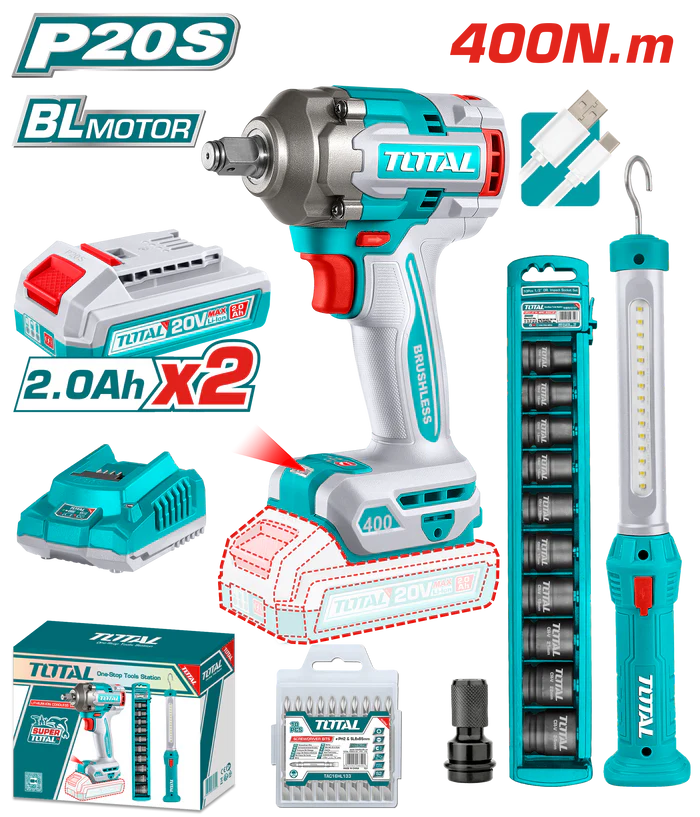 طقم دريل توتال 400 نيوتن 20 فولت مع طقم لقم تصادمية و بلادوس و 2 بطارية و شاحن – TOSLI23048