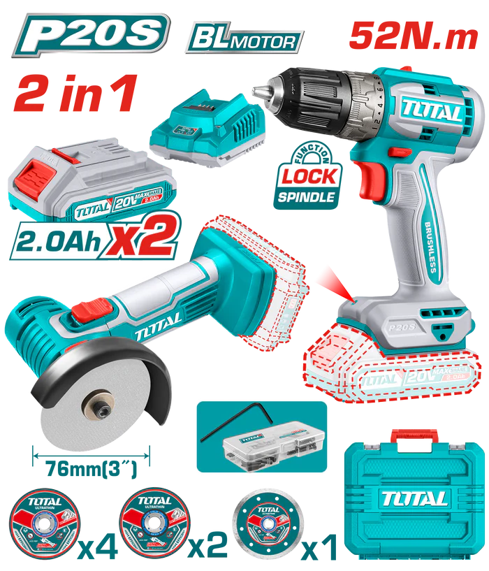 طقم كومبو توتال 20 فولت شنيور توتال 52 نوتن + صاروخ توتال ميني 3 بوصة + 2 بطارية 20 فولت 2 امبير – TCKLI20278