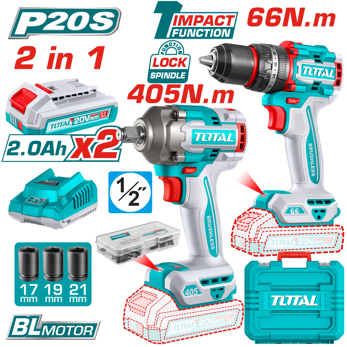 طقم كومبو 20 فولت 2 قطعة شنيور 20 فولت 66 نيوتن مع دريل 20 فولت 405 نيوتن و 2 بطارية 2 أمبير و شاحن توتال – TCKLI20286 – TCKLI20275